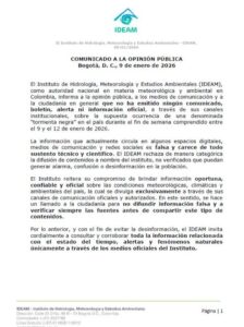 El Instituto también rechazó el uso de su nombre para respaldar contenidos no verificados que pueden generar alarma y confusión entre la ciudadanía, especialmente cuando se trata de información relacionada con el clima y posibles afectaciones en distintas regiones de Colombia